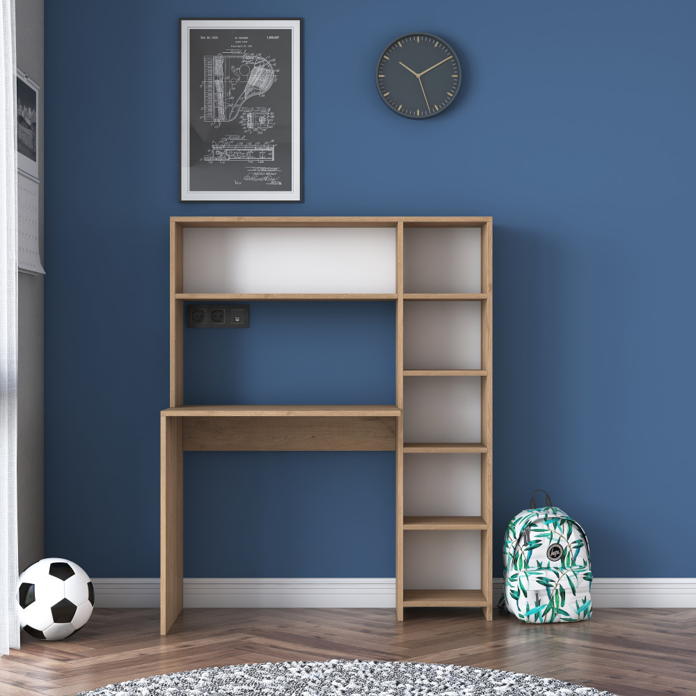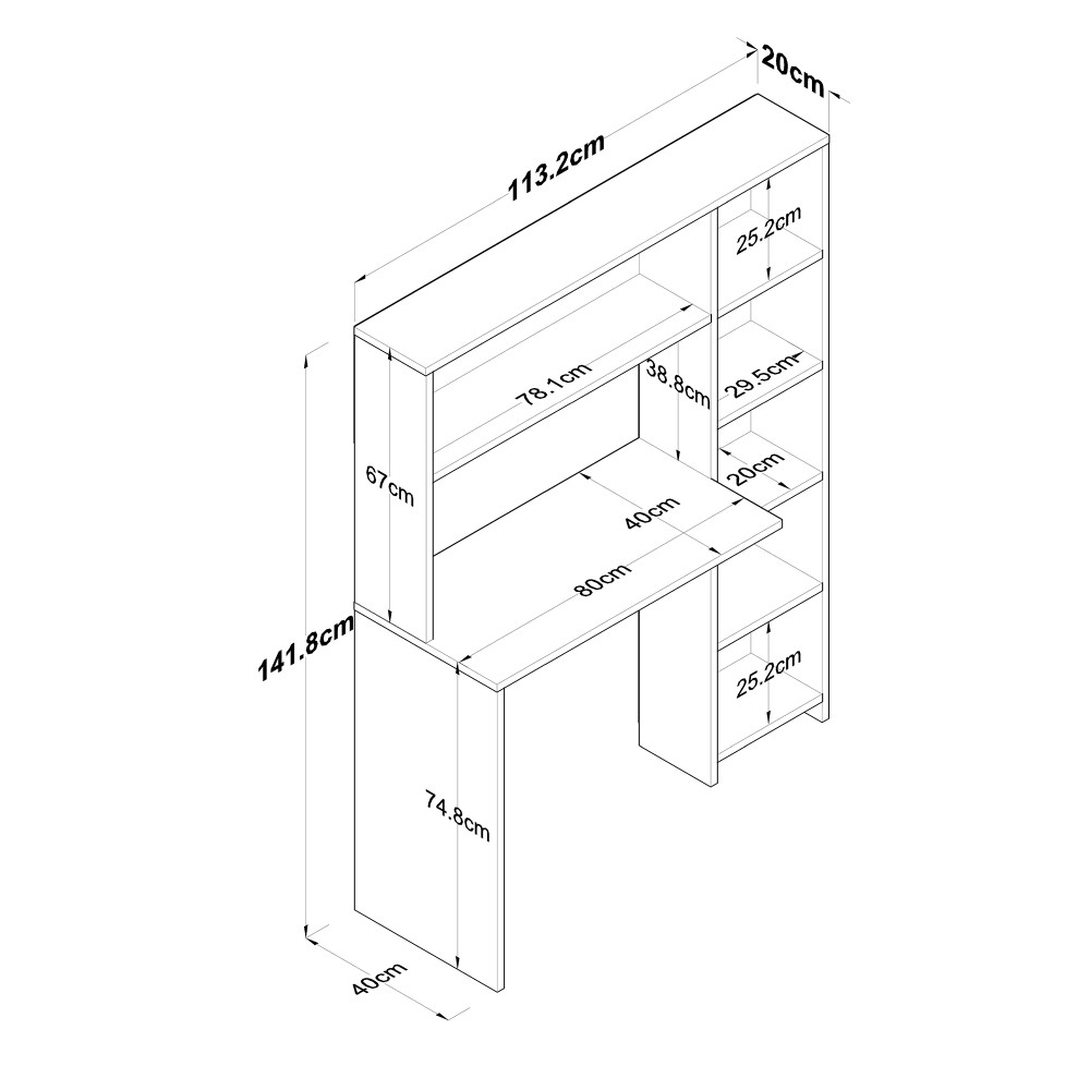 Dimension totale : Largeur : 113,2 cm - Profondeur : 20 cm - Hauteur : 141,8 cm Dimensions de la table : Largeur : 80 cm - Profondeur : 40 cm - Hauteur : 74,8 cm Des dimensions plus détaillées sont également indiquées dans les photos du produit. Le paquet comprend : 1 pièce Table de travail Gabarit d'installation et accessoires de connexion * Le contreplaqué est utilisé dans les parties étagères du produit. De cette manière, l'équilibre du produit est assuré.