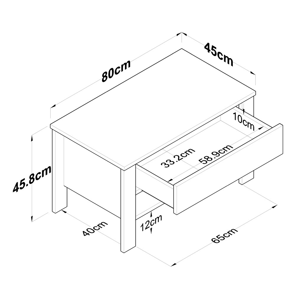 Table basse : Largeur : 80 cm - Profondeur : 45 cm - Hauteur : 45,6 cm